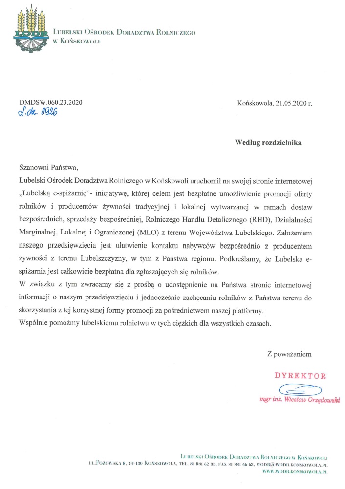 Informacji w sprawie Lubelskiej e-spiżarni udziela Pani Sylwia Figiel – pracownik Działu Rozwoju Obszarów Wiejskich - starszy specjalista ds. przetwórstwa na poziomie gospodarstwa i bezpieczeństwa żywności, e-mail: sfigiel@wodr.konskowola.pl, nr tel: 693 901 08181 889 06 16.