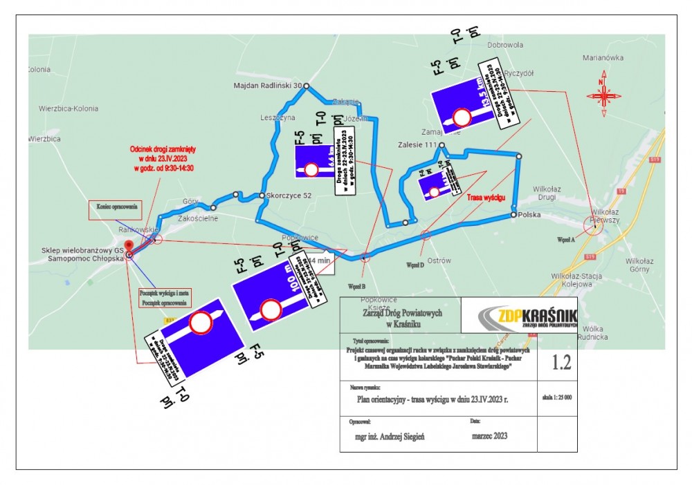 W związku z powyższym w godzinach od 09:30 do 14:30 utrudnione będzie poruszanie się drogą powiatową Wilkołaz – Urzędów oraz drogami gminnymi w wymienionych wyżej miejscowościach. Załącznik graficzny trasy w dniu 23 kwietnia znajduje się w kolejnym pliku.