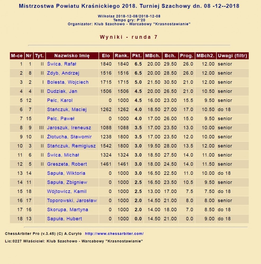 Podczas turnieju wyłoniony został mistrz powiatu kraśnickiego na rok 2018 w kategoriach seniorów oraz juniorów do lat 18. W kategorii seniorów zwyciężył Pan Rafał Świca, zaś w kategorii juniorów do lat 18 Maciej Stańczuk