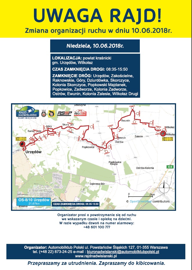 W dniu 10 czerwca 2018 r. na terenie gm. Wilkołaz odbędzie się Rajd Nadwiślański. W związku z powyższym tego dnia wystąpią lokalne zamknięcia dróg. Planowane zamknięcia odbędą się od godz. 8:10 do godz. 16:40.