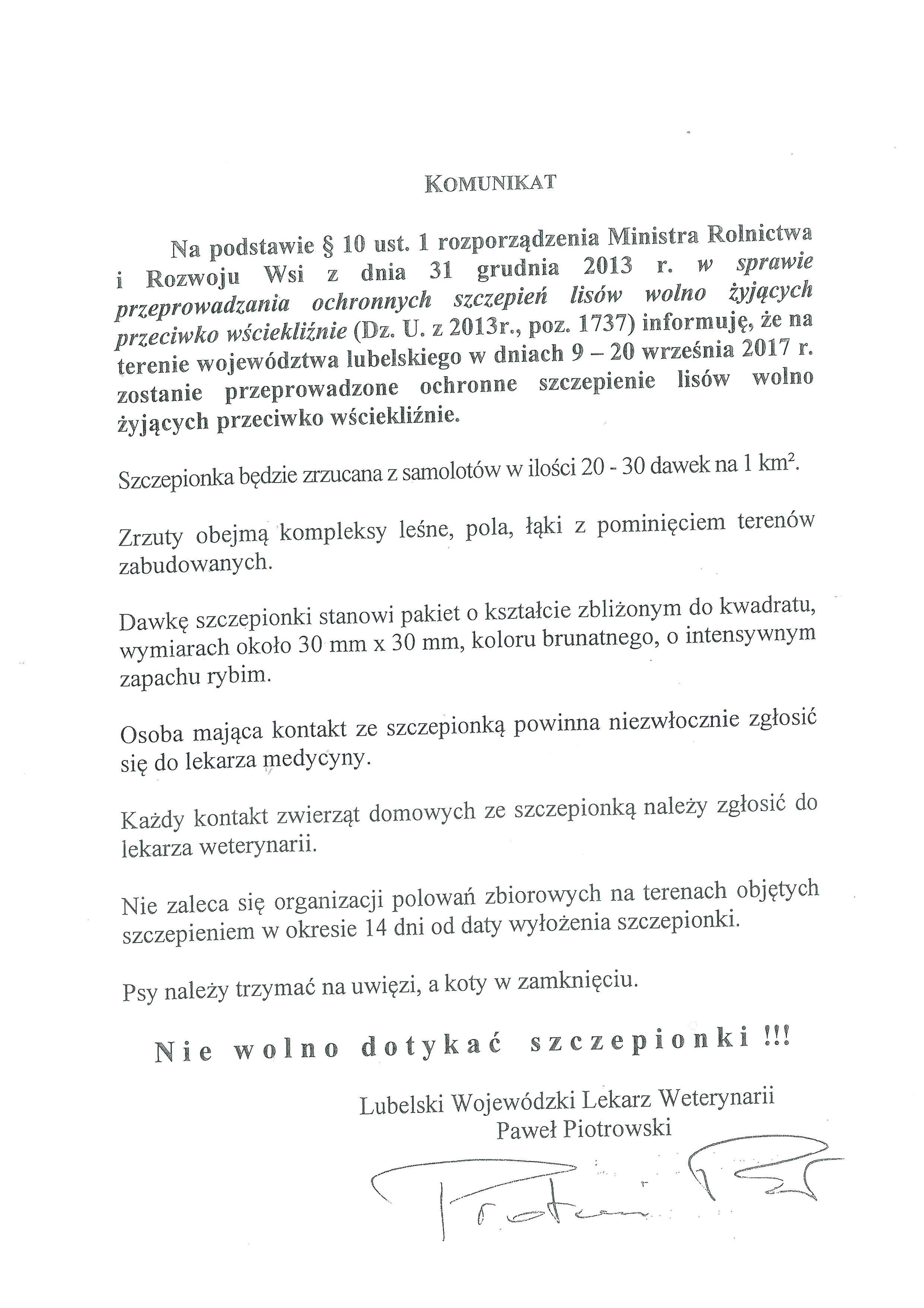Na podstawie § 10 ust. 1 rozporządzenia Ministra Rolnictwa i Rozwoju Wsi z dnia 31 grudnia 2013 r. w sprawie przeprowadzania ochronnych szczepień lisów wolno żyjących przeciwko wściekliźnie (Dz. U. z 2013r., poz. 1737) informuję, że na terenie województwa lubelskiego w dniach 9 - 20 września 2017 r. zostanie przeprowadzone ochronne szczepienie lisów wolno żyjących przeciwko wściekliźnie.