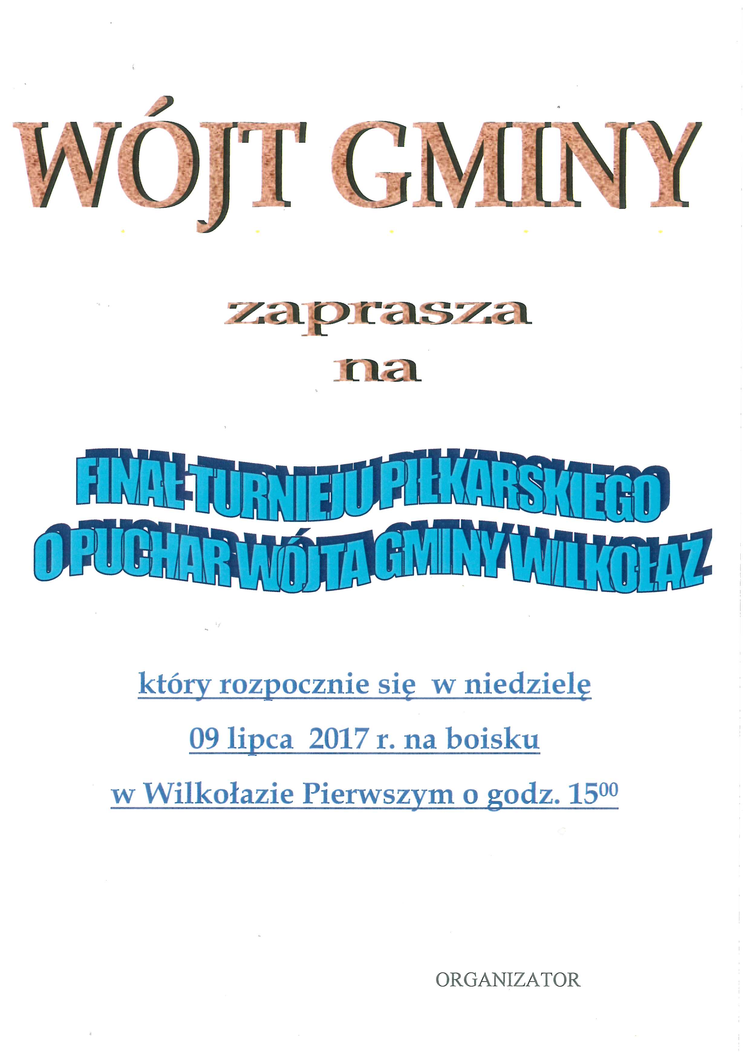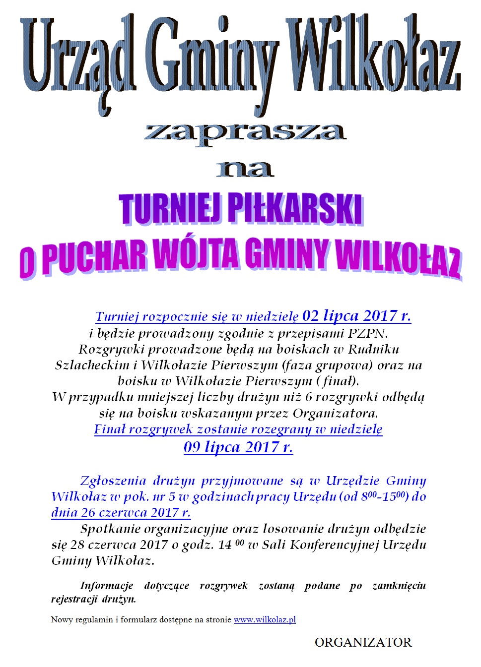 W dniu 02.07.2017 r. rozgrywki o Puchar Wójta Gminy Wilkołaz odbędą się tylko na boisku w Wilkołazie Pierwszym od godziny 15.00.
