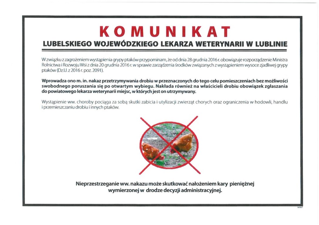 W związku z zagrożeniem wystąpienia grypy ptaków przypominam, że od dnia 28 grudnia 2016 r. obowiązuje rozporządzenie Ministra Rolnictwa i Rozwoju Wsi z dnia 20 grudnia 2016 r. w sprawie zarządzenia środków związanych z wystąpieniem wysoce zjadliwej grypy ptaków.Załączniki: