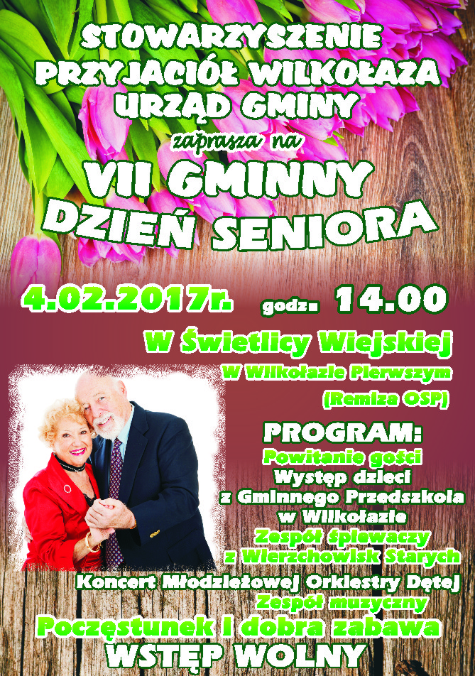 W dniu 4 lutego 2017 r. w Świetlicy Wiejskiej w Wilkołazie Pierwszym odbył się VII Gminny Dzień Seniora, który został zorganizowany i przygotowany przez Stowarzyszenie Przyjaciół Wilkołaza przy wsparciu finansowym Urzędu Gminy. Rangę uroczystości podnieśli i zaszczycili nas swoją obecnością Wójt Gminy – Pan Paweł Głąb, Proboszcz Parafii – Ks. Janusz Świtaj, Przewodniczący Rady Gminy – Pan Mieczysław Lisiecki, Dyrektor Gminnego Przedszkola w Wilkołazie – Pani Wanda Cegłowska, Prezes LGD Ziemi Kraśnickiej – Pani Wioletta Wilkos, Dyrektor Gminnej Biblioteki Publicznej w Wilkołazie – Pani Bożena Nagajek, Dyrektor Domu Opieki Społecznej w Popkowicach – Pani Emilia Nicał, Kapelmistrz Młodzieżowej Orkiestry Dętej w Wilkołazie – Pan Kazimierz Kołodziej.