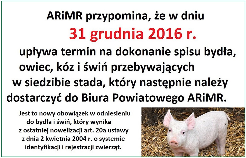 Agencja Restrukturyzacji i Modernizacji Rolnictwa informuje, że w związku ze zmianą przepisów dotyczących identyfikacji i rejestracji zwierząt, od 18 października 2016 r. rolnicy posiadający zwierzęta gospodarskie muszą stosować się do nowych zasad. Nowe regulacje dotyczą zwłaszcza posiadaczy trzody chlewnej. Mają one na celu zapobieganie rozprzestrzenianiu się chorób zakaźnych wśród zwierząt. Poniżej przedstawione są najważniejsze zmiany, które obowiązują od 18 października br.