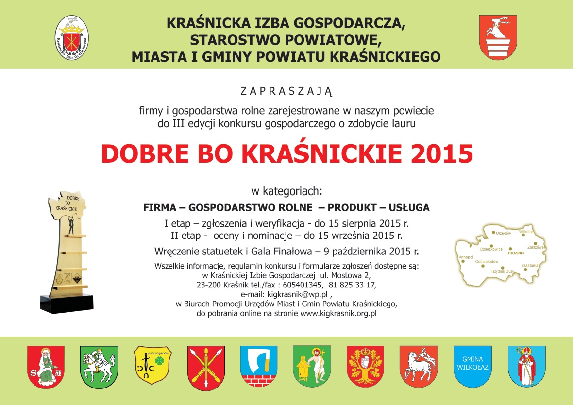 Wójt Gminy Wilkołaz zaprasza przedsiębiorców z terenu Gminy Wilkołaz do wzięcia udziału w kolejnej, III edycji konkursu „Dobre , bo Kraśnickie 2015”. Celem konkursu jest promocja najlepszych przedsiębiorstw z powiatu kraśnickiego oraz kształtowanie pozytywnego wizerunku województwa lubelskiego i powiatu kraśnickiego jako dogodnego obszaru prowadzenia działalności gospodarczej. Zgłoszenia należy kierować do 31 sierpnia 2015 roku do Sekretariatu Konkursu w siedzibie Kraśnickiej Izby Gospodarczej przy ul. Mostowej 2 w Kraśniku.