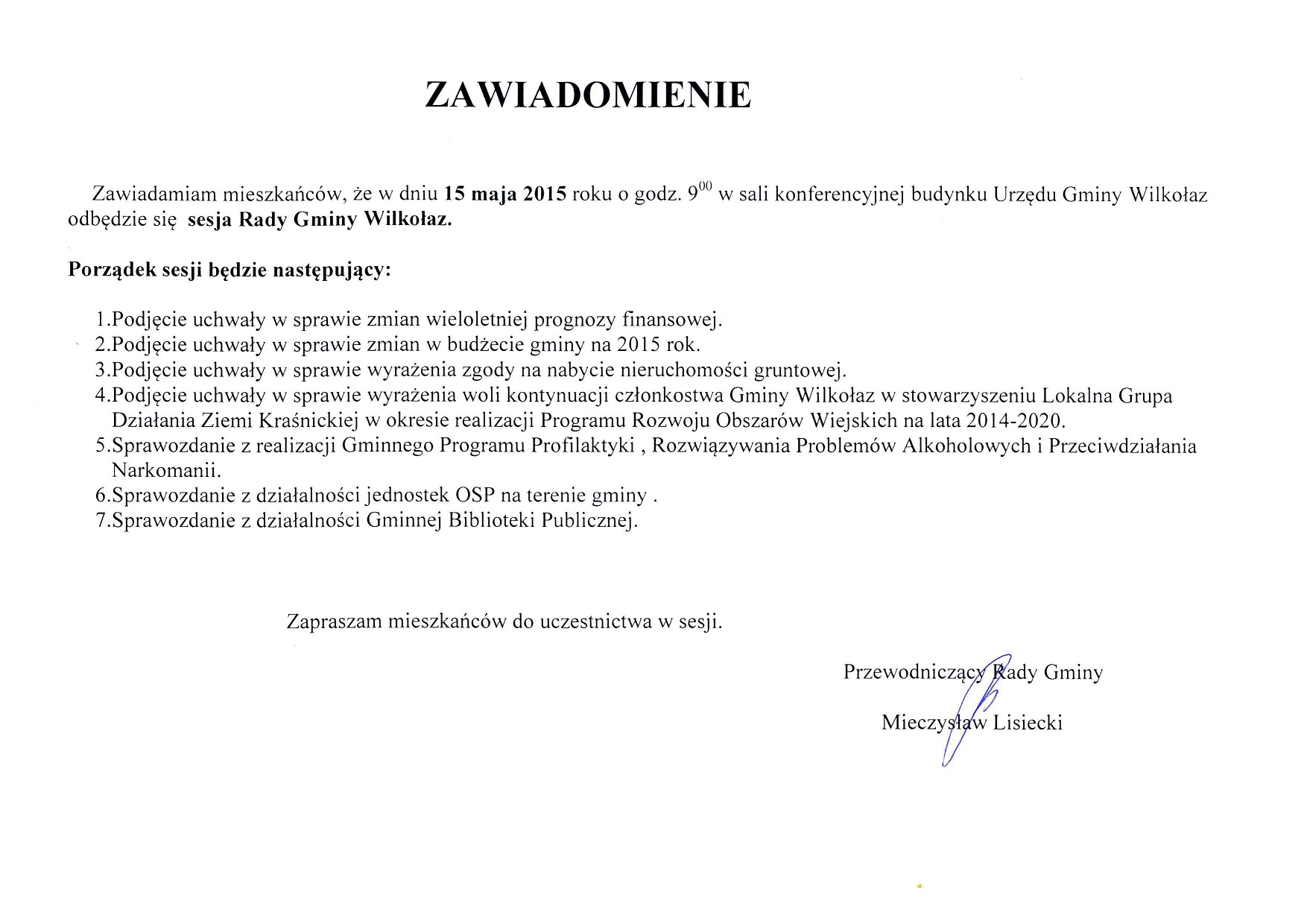 W dniu 15 maja 2015 roku w Urzędzie Gminy Wilkołaz odbyła się Sesja Rady Gminy Wilkołaz. Wójt Gminy Wilkołaz Paweł Głąb wraz z Przewodniczącym Rady Gminy Mieczysławem Lisieckim złożyli serdeczne podziękowania Pani Annie Pęczek, Pani Halinie Krawczyk, Panu Ryszardowi Tomala oraz Panu Eugeniuszowi Kunie za pełnienie funkcji sołtysa oraz zaangażowanie i prace społeczną na rzecz sołectw Ostrów, Wólka Rudnicka, Wilkołaz Dolny i Wilkołaz Trzeci oraz Gminy Wilkołaz.