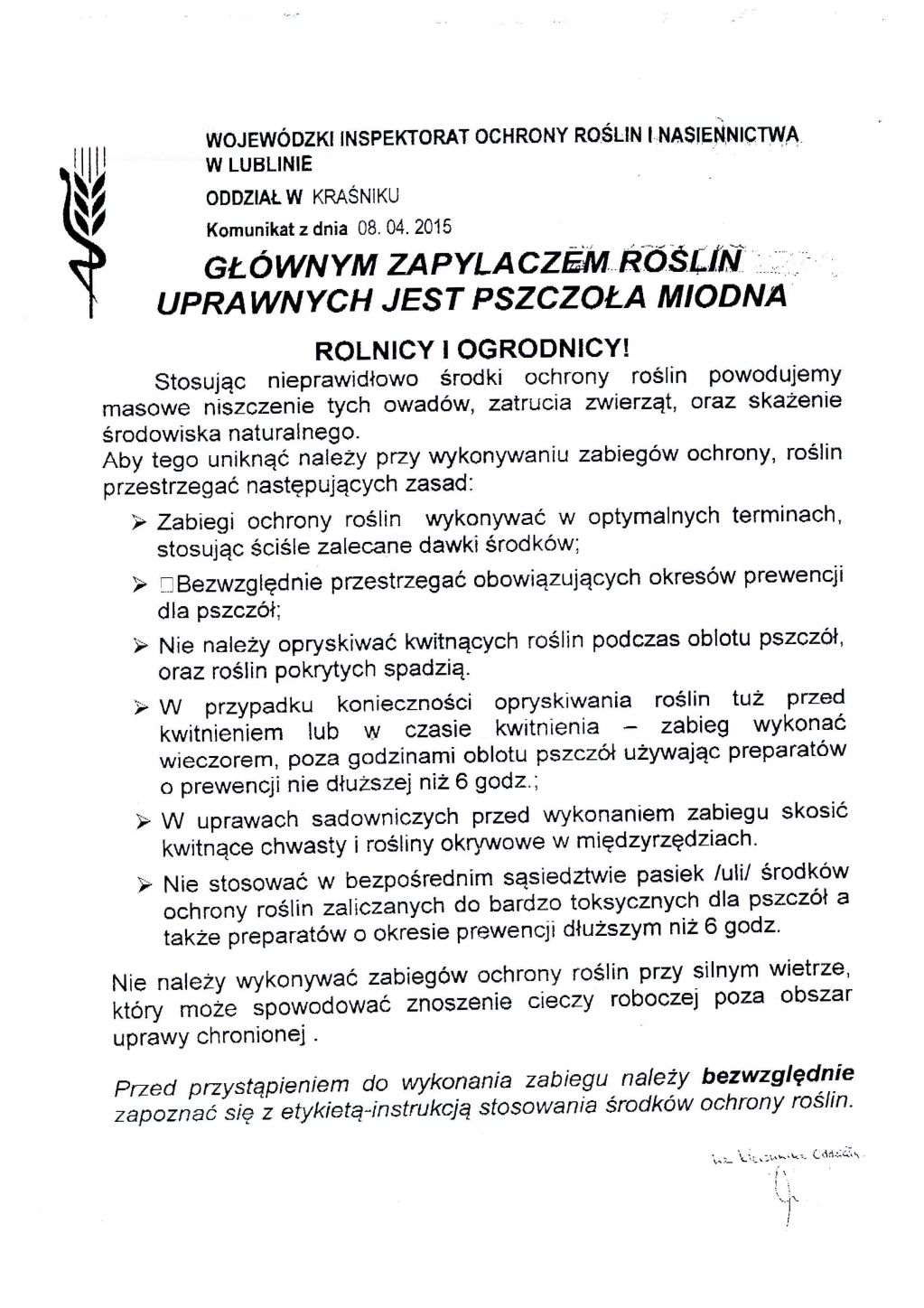 W dniu 26 kwietnia 2015 roku o godz. 14.30 w Zajeździe "Stolnik" w Wilkołazie Pierwszym będzie wydawany lek przeciwko warrozie.