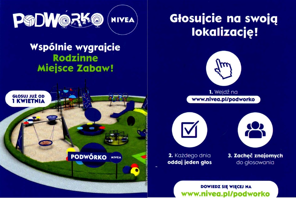 Wspólnie Wygrajcie Rodzinne Miejsce Zabaw! Zapraszamy do głosowania na plac zabaw "Podwórko NIVEA" w Wilkołazie Trzecim. Głosować można od 1 kwietnia 2015 roku na stronie: www.nivea.pl/podwórko. Każdego dnia można oddać jeden głos!