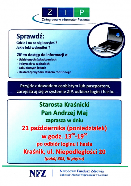 Ze względu na duże zainteresowanie mieszkańców Starosta Kraśnicki Andrzej Maj, przy współpracy z NFZ, zdecydował o ponownym uruchomieniu mobilnego stanowiska Zintegrowanego Informatora Pacjenta (ZIP). Zgłaszając się z dowodem osobistym, wszyscy zainteresowani otrzymają login i hasło umożliwiające dostęp do informacji o dotychczas udzielonych świadczeniach zdrowotnych oraz kosztach ich sfinansowania przez NFZ.
