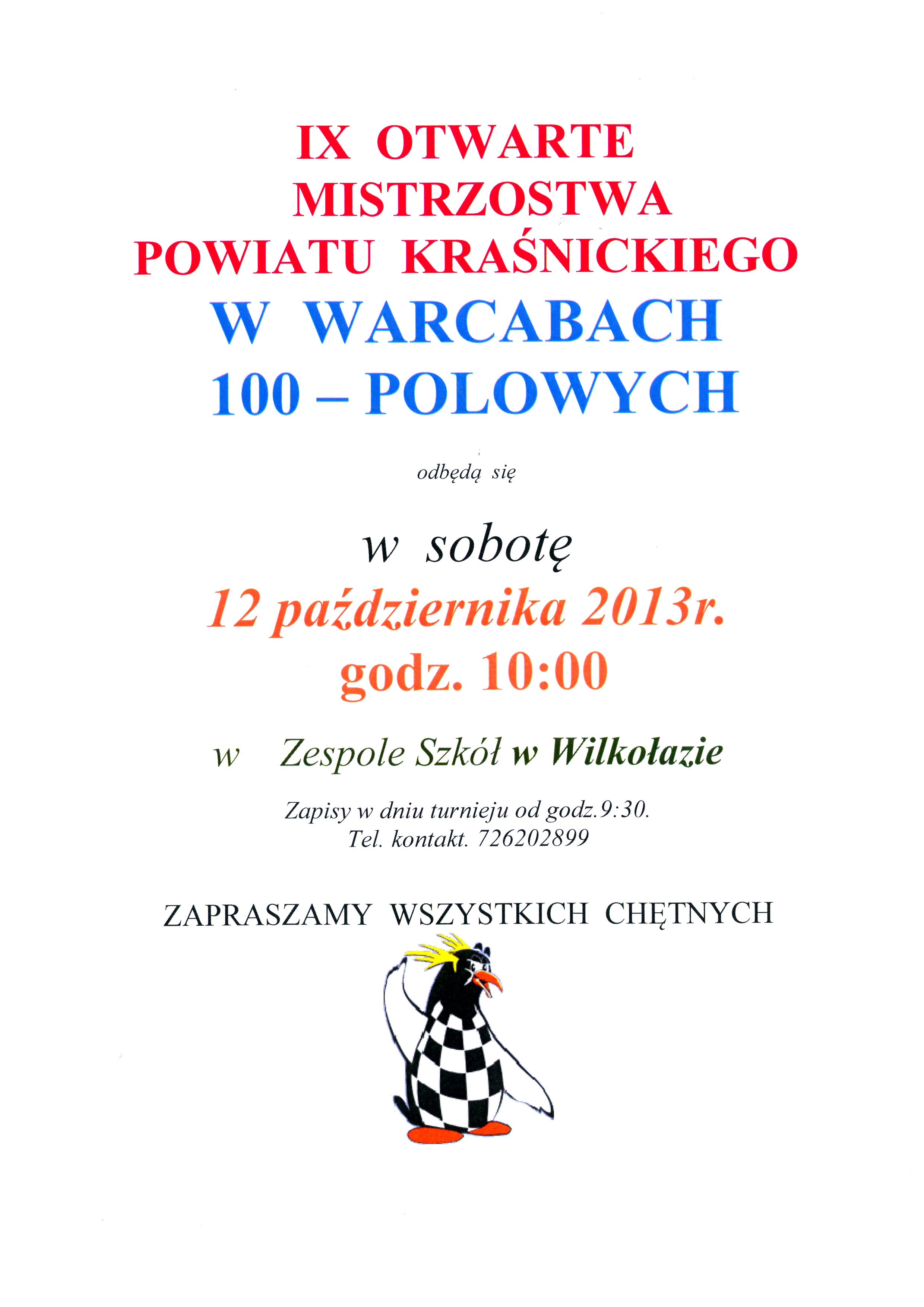 W sobotę, 12 października 2013 roku, w Zespole Szkół w Wilkołazie rozegrane zostały IX Otwarte Mistrzostwa Powiatu Kraśnickiego w warcabach 100-polowych.