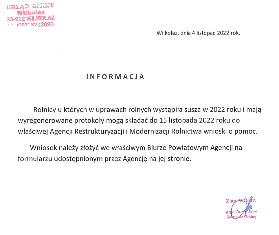 W razie pytań  informacje dostępne są w Urzędzie Gminy Wilkołaz w pokoju Nr 7, tel. 818217983 oraz adresem email: iwona.kloc@wilkolaz.pl.