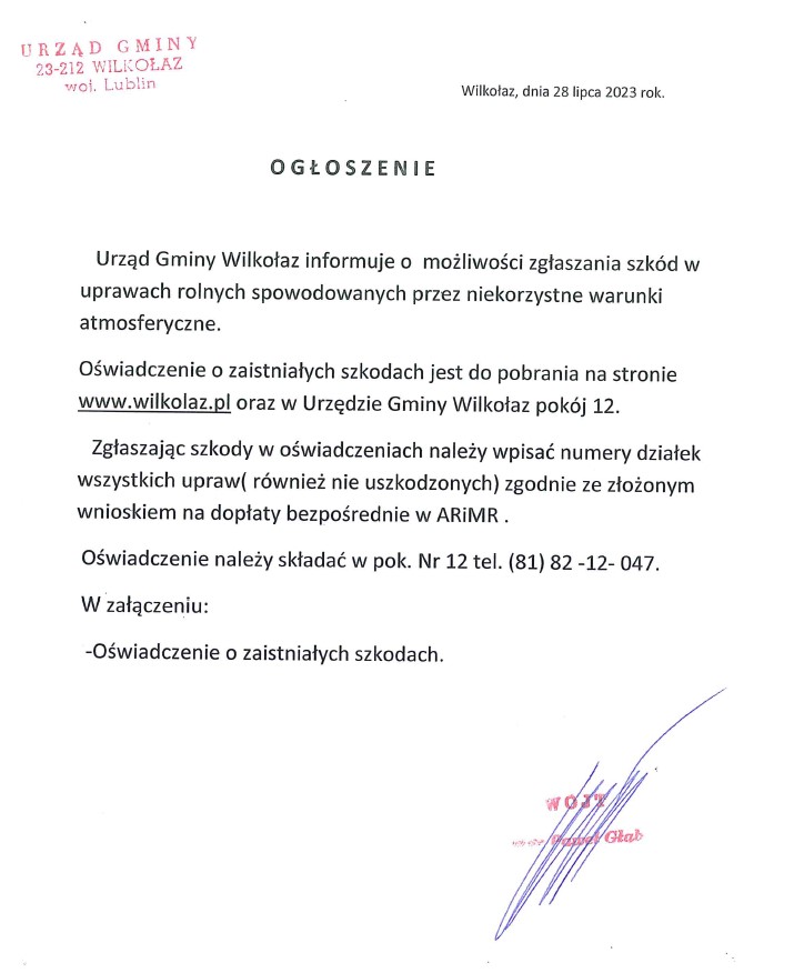 • Oświadczenia właścicieli gruntów wyrażających zgodę na zwrot podatku akcyzowego dla dzierżawcy (dotyczy tylko umów ustnych składanych pierwszy raz w tym roku, do pobrania na stronie internetowej UG oraz pokój 9 )