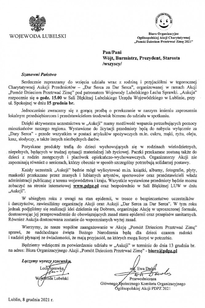 Zaproszenie do wzięcia udziału w tegorocznej Charytatywnej Aukcji Przedmiotów - "Dar Serca za Dar Serca" w ramach Akcji  "Pomóż Dzieciom Przetrwać Zimę"