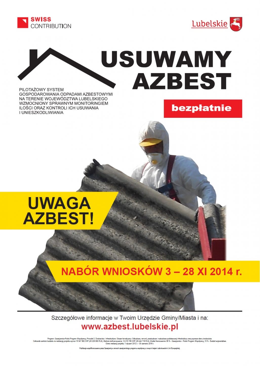 Wójt Gminy Wilkołaz informuje, że Gmina Wilkołaz przystąpiła w 2012 roku do „Pilotażowego systemu gospodarowania odpadami azbestowymi na terenie Województwa Lubelskiego wzmocnionego sprawnym monitoringiem, ilości oraz kontroli ich usuwania i unieszkodliwiana” w ramach Szwajcarsko-Polskiego Programu Współpracy, Obszar Priorytetowy: 2. Środowisko i Infrastruktura, Obszar Tematyczny: Odbudowa, remont, przebudowa i rozbudowa podstawowej infrastruktury oraz poprawa stanu środowiska.