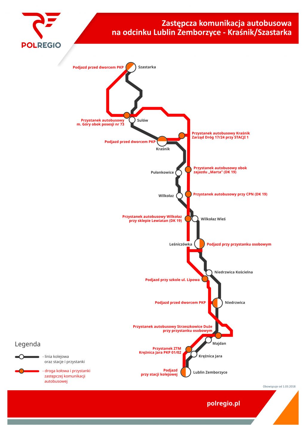 Dla pociągów w relacji Lublin – Szastarka – Lublin autobusowa komunikacja zastępcza BUS zostanie wprowadzona na odcinku Lublin Zemborzyce – Szastarka – Lublin Zemborzyce.