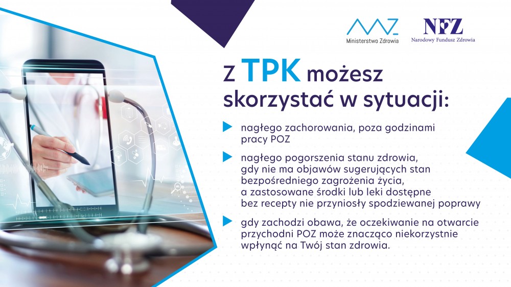 TPK działa na podobnych zasadach do nocnej i świątecznej opieki zdrowotnej, z tą różnicą, że konsultacje udzielane są przez telefon. Jeśli poradnia lekarza rodzinnego jest już zamknięta, a stan zdrowia budzi Twój niepokój, wtedy możesz skorzystać ze zdalnej porady z pielęgniarką lub położną, bądź z lekarzem.