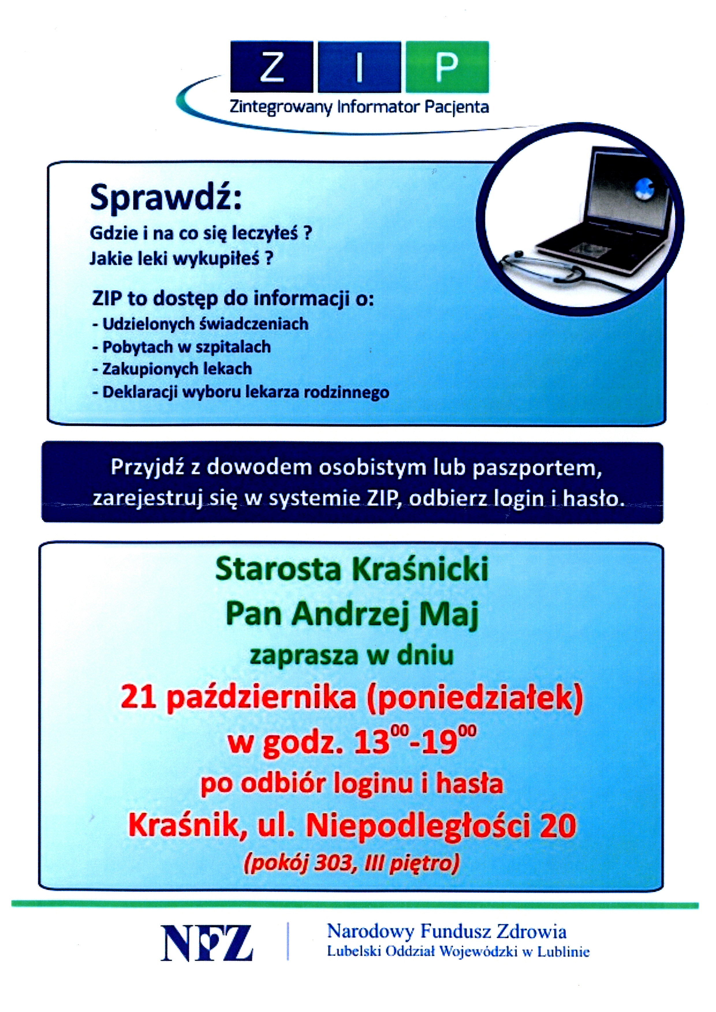 Ze względu na duże zainteresowanie mieszkańców Starosta Kraśnicki Andrzej Maj, przy współpracy z NFZ, zdecydował o ponownym uruchomieniu mobilnego stanowiska Zintegrowanego Informatora Pacjenta (ZIP). Zgłaszając się z dowodem osobistym, wszyscy zainteresowani otrzymają login i hasło umożliwiające dostęp do informacji o dotychczas udzielonych świadczeniach zdrowotnych oraz kosztach ich sfinansowania przez NFZ.