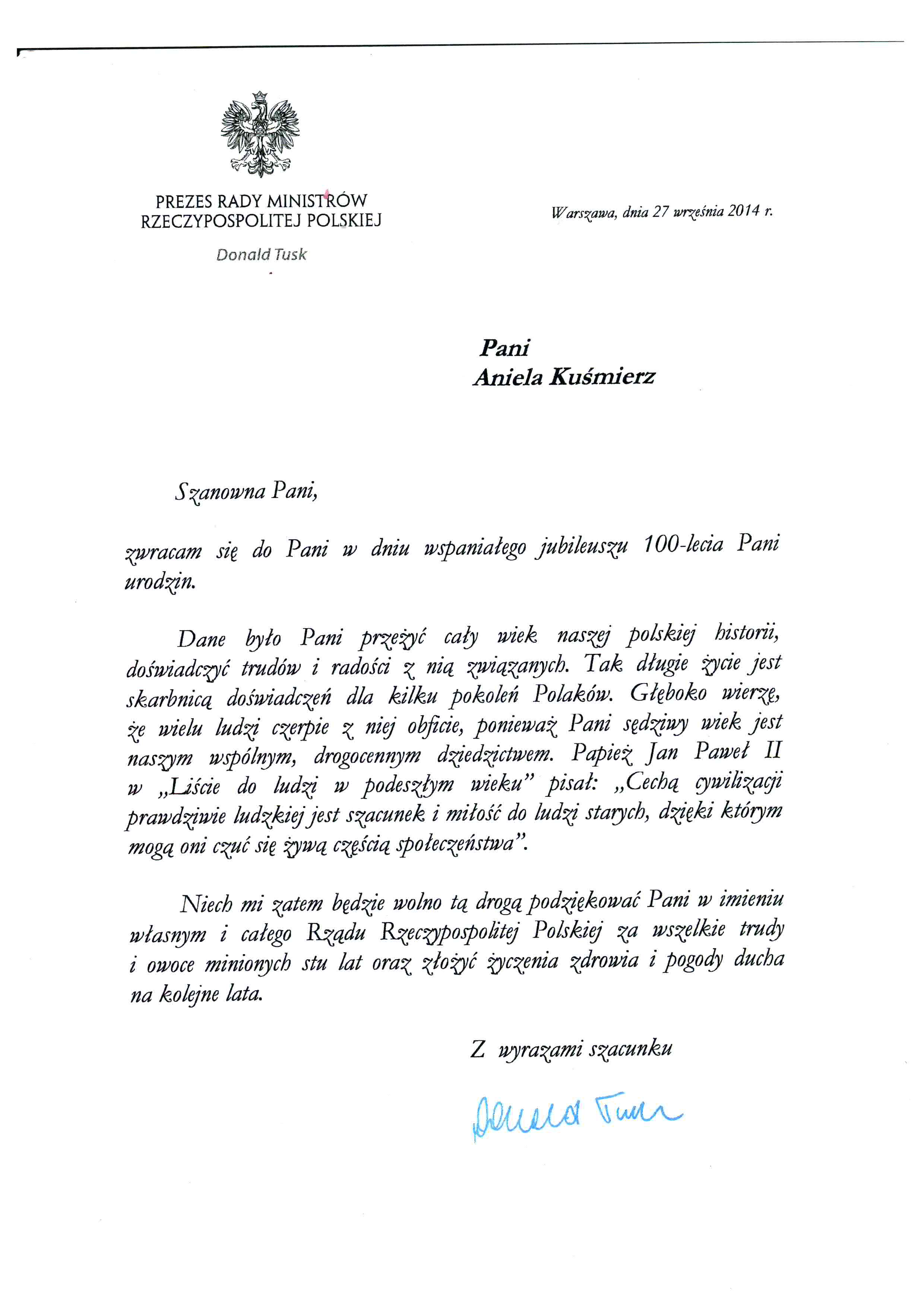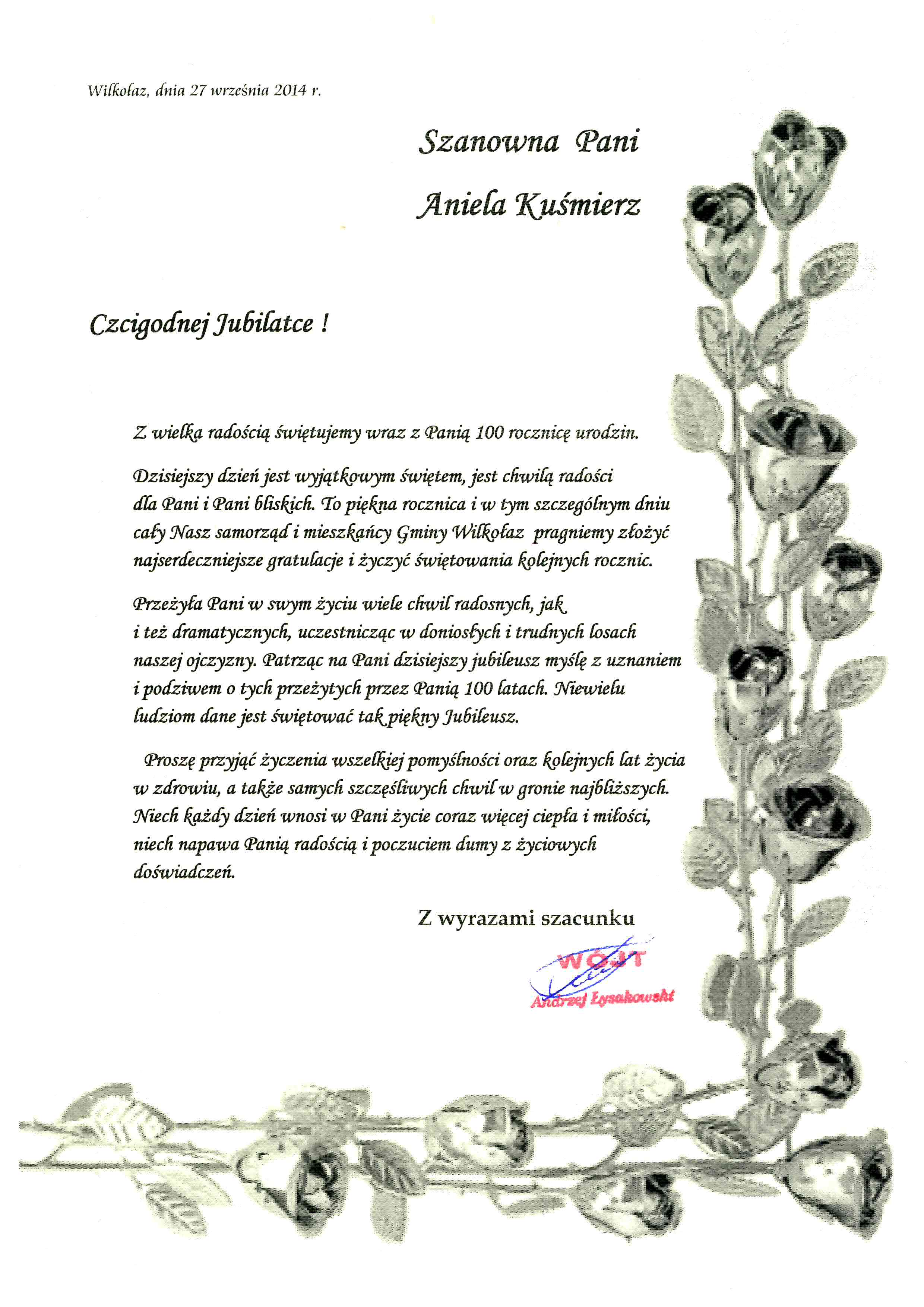 Setna rocznica urodzin stała się także idealną okazją do wspomnień najważniejszych wydarzeń w życiu Jubilatki. Kiedy Pani Aniela Kuśmierz przyszła na świat, Polska znajdowala sie pod zaborami. Akt urodzenia jest sporządzony i spisany  w języku rosyjskim. Znajduje sie tam wzmianka, że  urodziła sie w rodzinie  ziemiańskiej. Jej rodzice Marianna i Jan Hara byli mieszkańcami Wilkołaza Pierwszego.