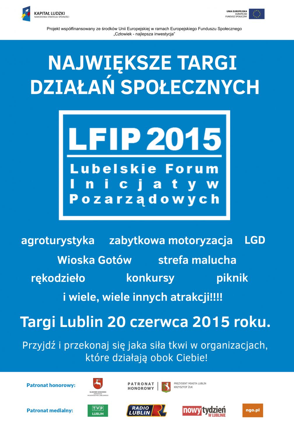 Związek Stowarzyszeń Forum Lubelskich Organizacji Pozarządowych serdecznie zaprasza na LUBELSKIE FORUM INICJATYW POZARZĄDOWYCH, które odbędzie się w dniach 19‐20 czerwca 2015r. (piątek‐sobota) w Centrum Wystawienniczo-Konferencyjnym Targi Lublin S.A. przy ul. Dworcowej 11.
