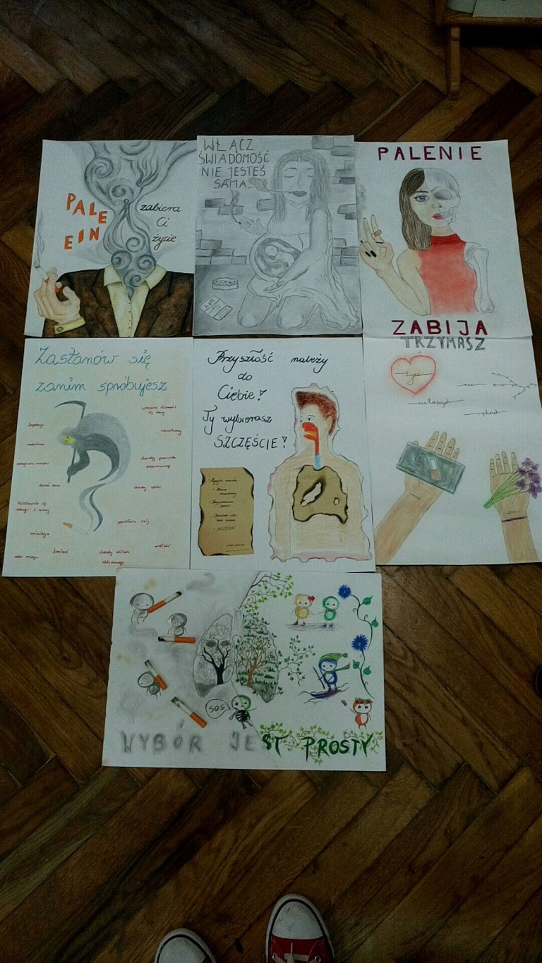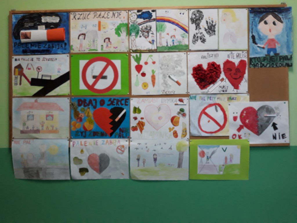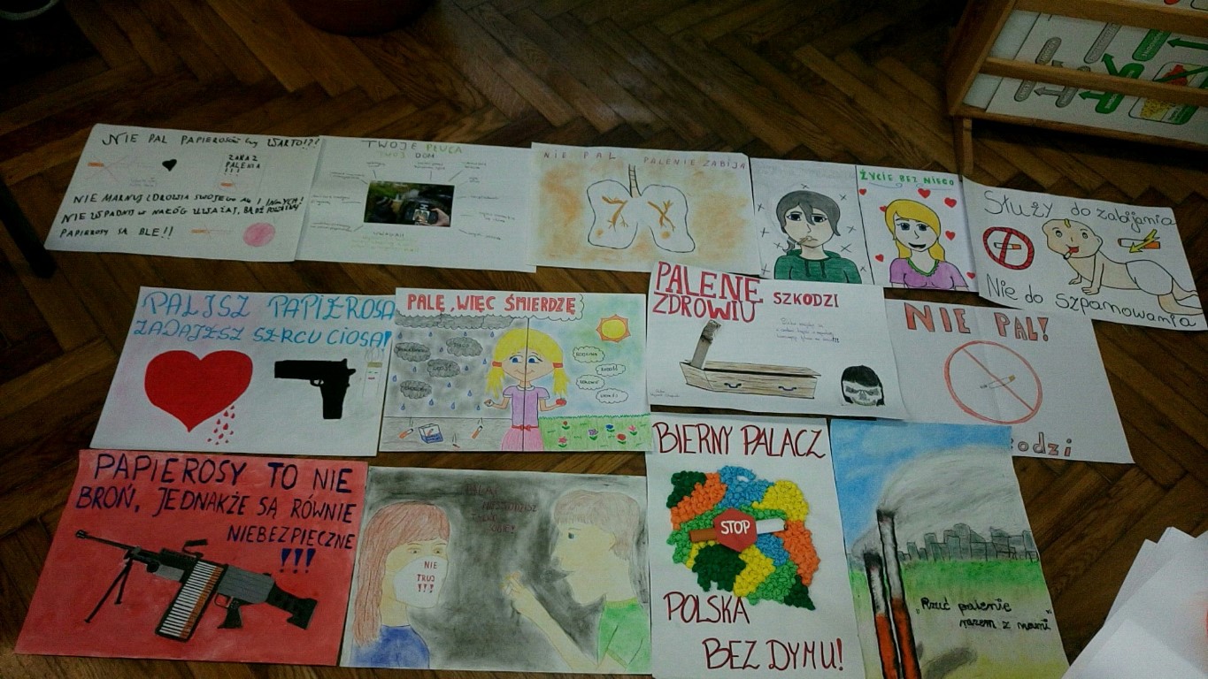 Wykonane przez uczniów szkoły podstawowej prace promowały przesłanie: Szkodliwość palenia biernego.