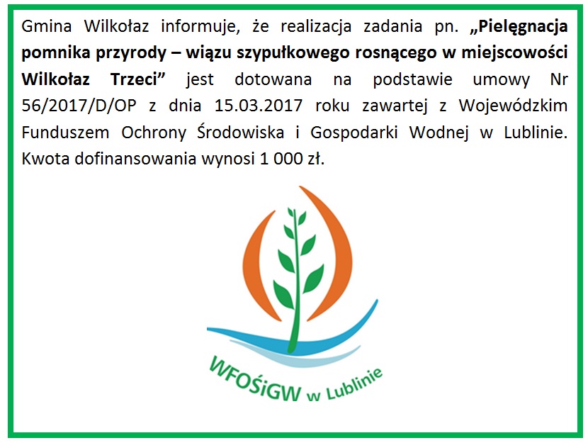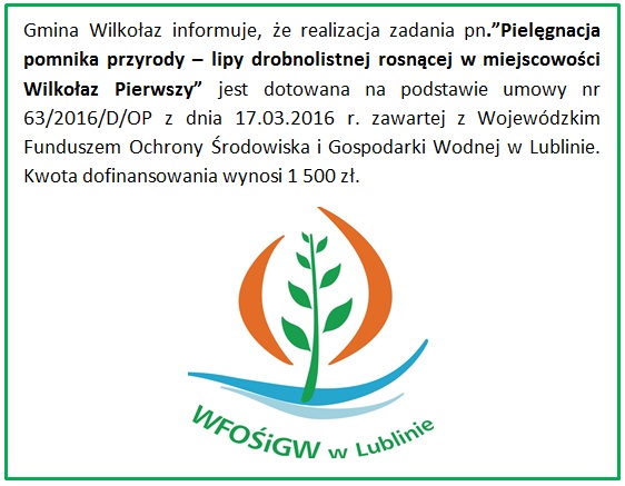 Gmina Wilkołaz informuje, że realizacja zadania pn.”Pielęgnacja pomnika przyrody – dębu szypułkowego rosnącego w miejscowości Wilkołaz Pierwszy” jest dotowana na podstawie umowy nr 90/2014/D/OP z dnia 08.04.2014 r. zawartej z Wojewódzkim Funduszem Ochrony Środowiska i Gospodarki Wodnej w Lublinie. Kwota dofinansowania wynosi 850 zł.