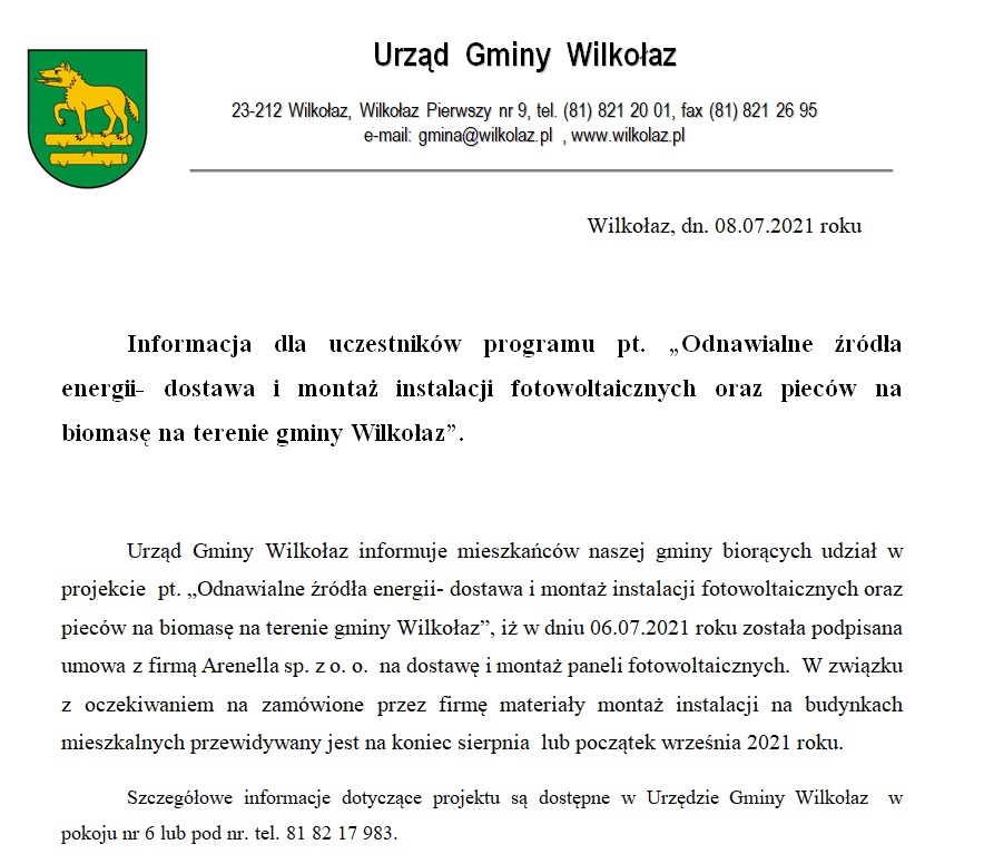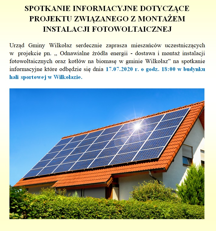 Wójt Gminy Wilkołaz, informuje iż w terminie od 14 września 2020 r. do dn. 25 września 2020 r. prowadzony będzie dodatkowy nabór dla Mieszkańców zainteresowanych montażem instalacji fotowoltaicznych w ramach projektu „Odnawialne źródła energii - dostawa i montaż instalacji fotowoltaicznych oraz kotłów na biomasę w gminie Wilkołaz”.